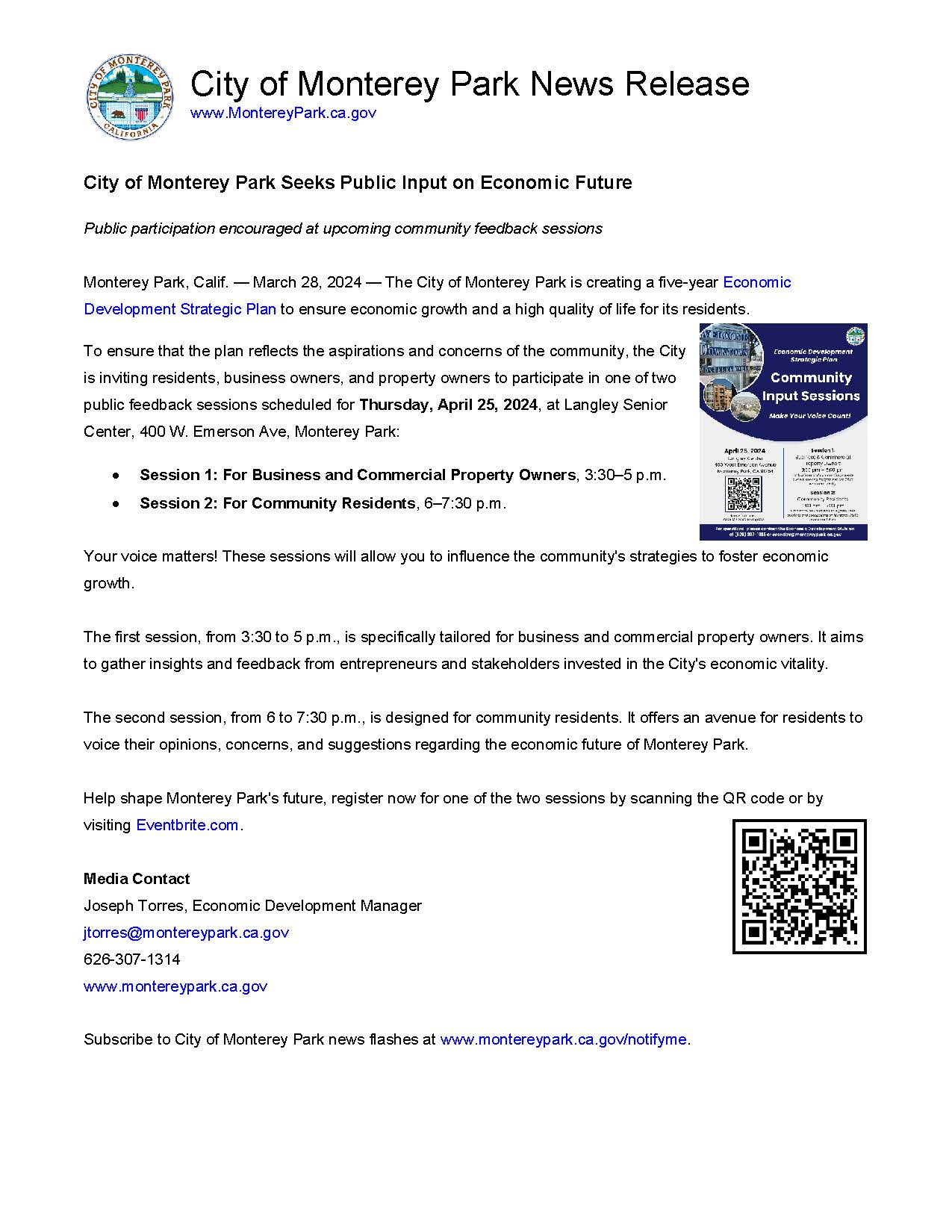 The City of Monterey Park is creating a five-year Economic Development Strategic Plan to ensure economic growth and a high quality of life for its residents.